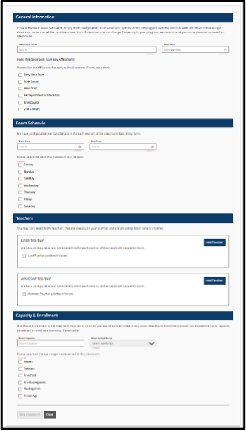 Add classroom general information, room schedule, teachers, and capacity & enrollment. Once a classroom is set up, you do not need to add this classroom each year.