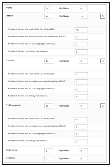 Enter the number of children enrolled in each age group. Enter the number of “high needs” children per classroom. A child should be counted as “high needs” if meets one or more of the following criteria: