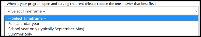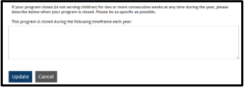 In the next section, please describe any time your program is closed for more than 2 weeks and does not serve children. Click Update if any changes are made.