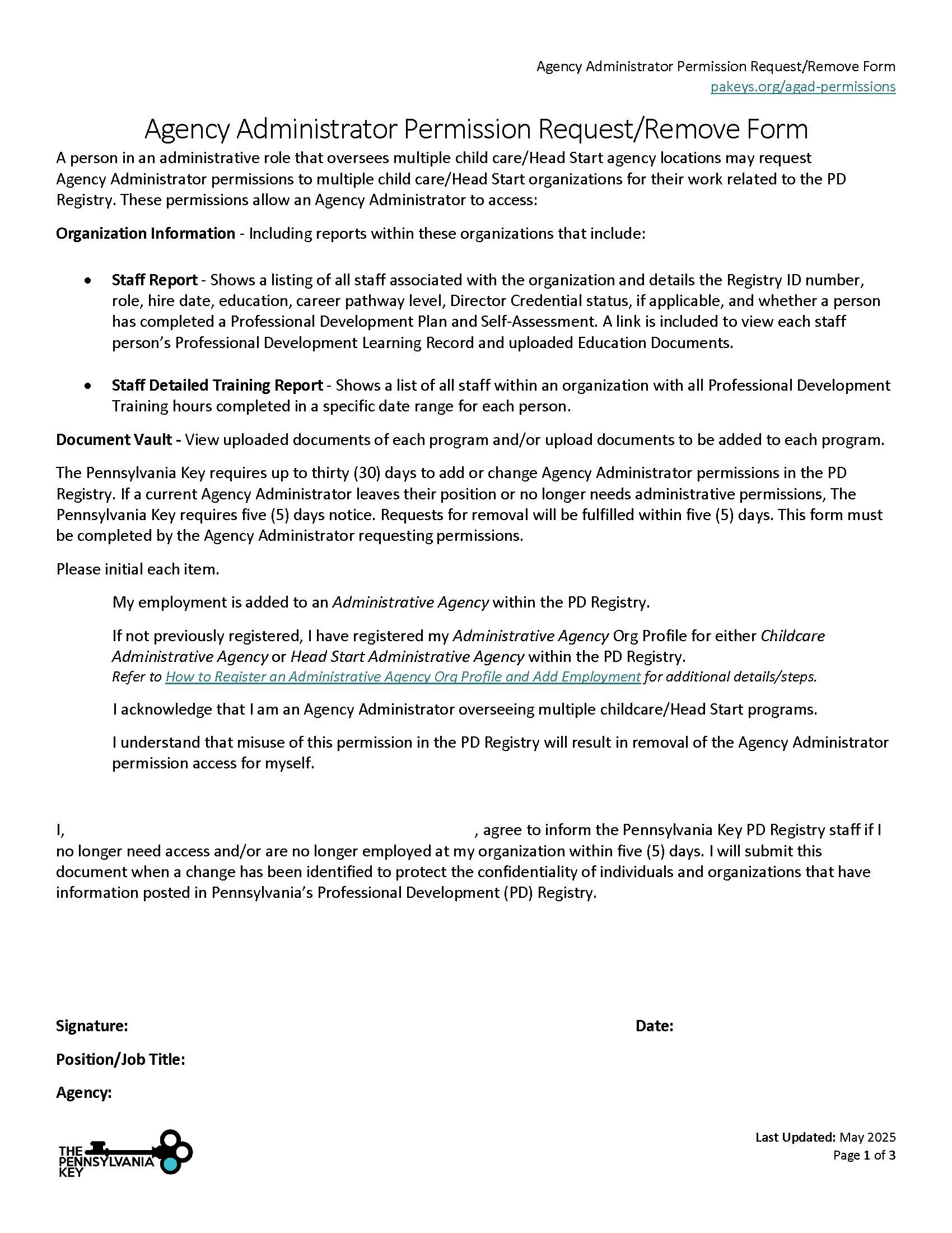 Agency Administrator Permission Request/Remove Form