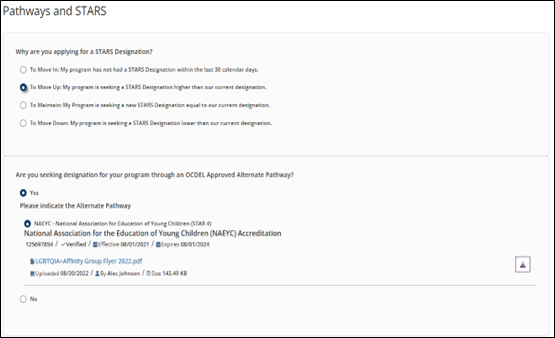 Click the appropriate selection when applying for a STARS designation. You will then choose Yes, you are seeking designation through an Alternate Pathway. This will populate any accreditation you have uploaded in your Program Info tab. Select the accreditation you are choosing as your Alternate Pathway. Failure to check yes to the Alternate Pathway question and to choose an accrediting agency will result in the application needed to be returned to the provider.