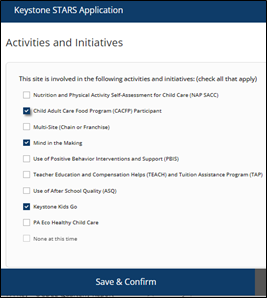 Check all applicable options regarding the activities and initiatives at the site, when finished click Save & Confirm at the bottom of the screen.
