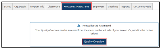 Within your organization’s profile, select Keystone STARS/Grants tab and click Quality Overview underneath.
