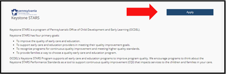 Click on Apply on the section noted as Keystone STARS or Annual Renewal, whichever will apply to your program at the time.