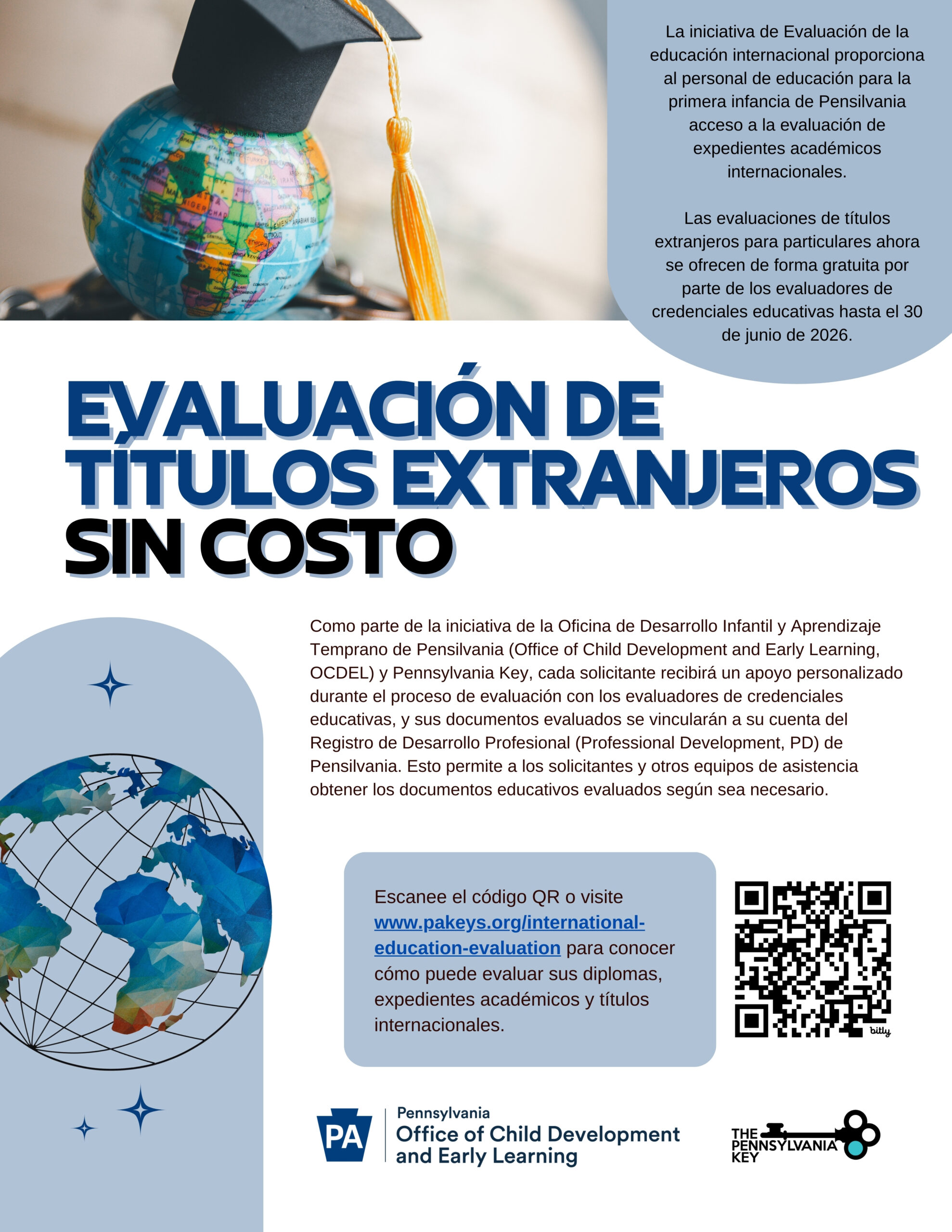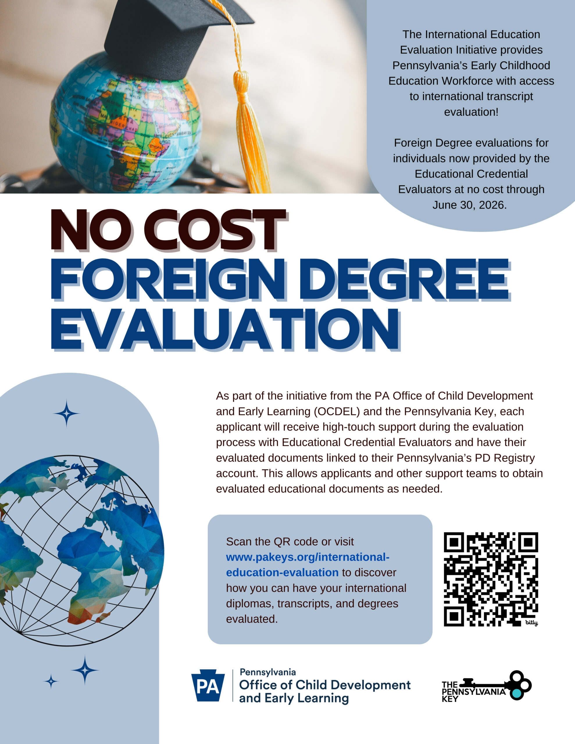 Formally known as Foreign Degree Evaluation, the International Education Evaluation provides Pennsylvania’s Early Childhood Education Workforce with access to international transcript evaluation!