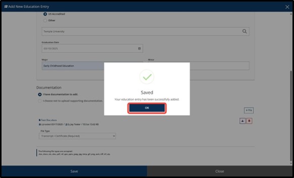 Click OK to successfully save your education entry.
