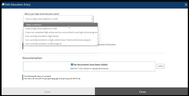 Select Your high school education status from the drop-down.