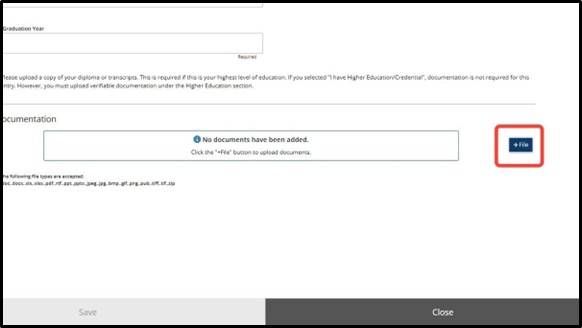 Click File and upload your documentation (Diploma, transcripts, etc.)