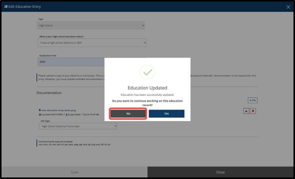 Click No to return back to your “Education Summary” page. You will then be able to add additional education.