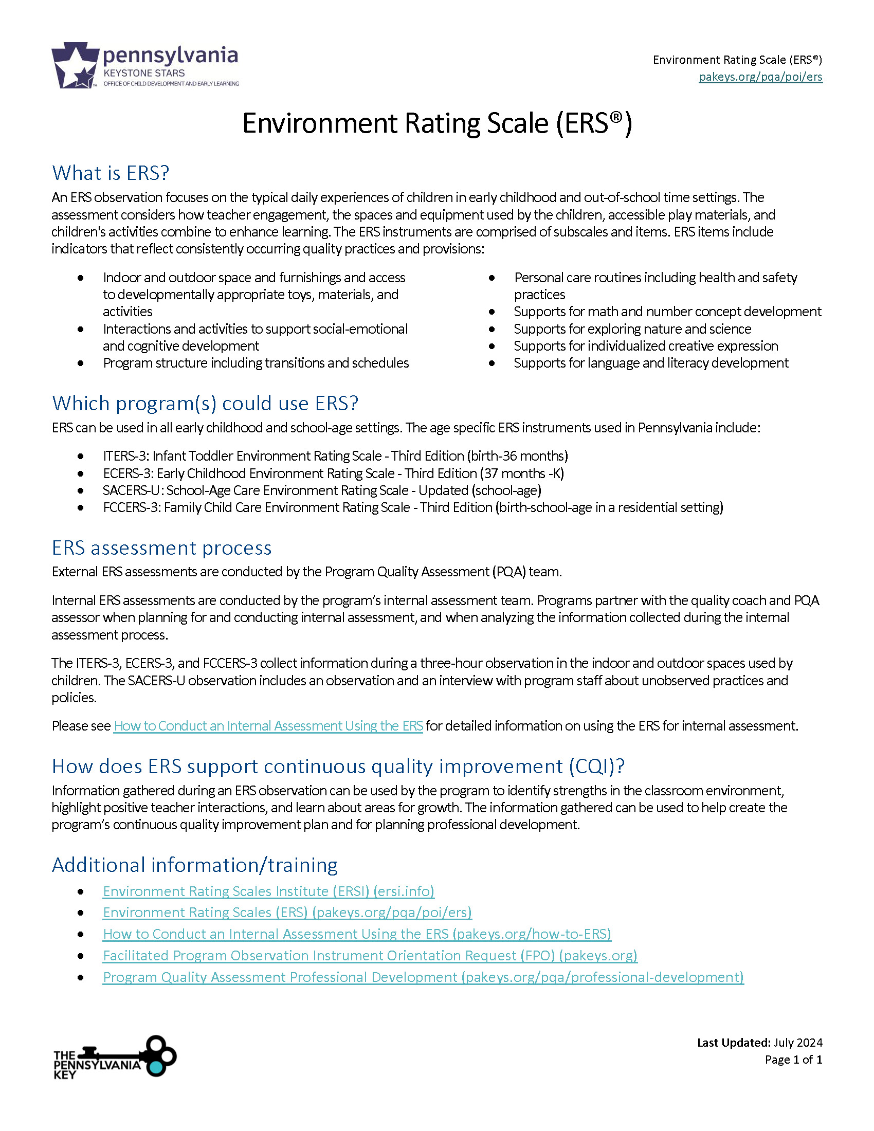 ERS can be used in all early childhood and school-age settings. The age specific ERS instruments used in Pennsylvania include:
