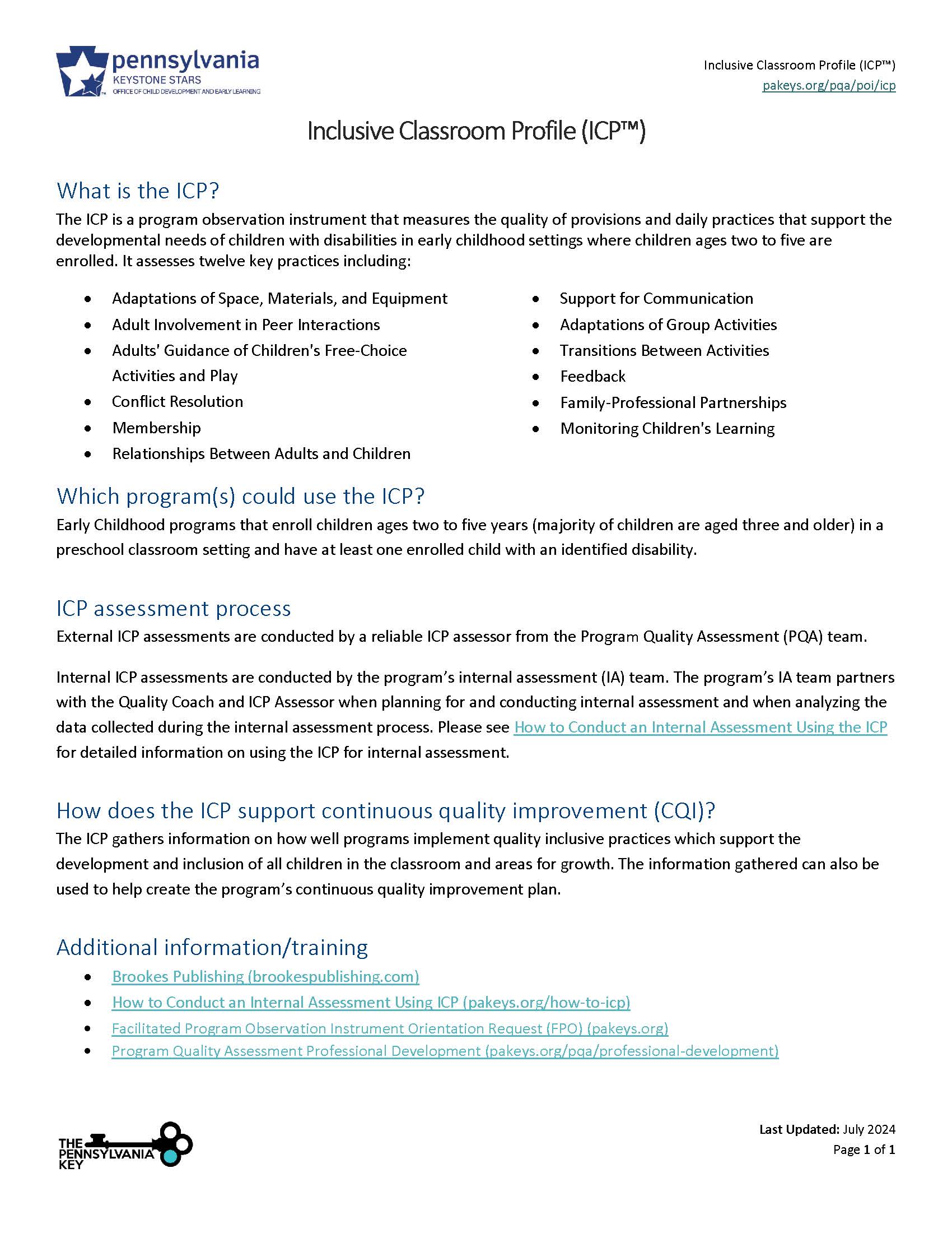 The ICP gathers information on how well programs implement quality inclusive practices which support the development and inclusion of all children in the classroom and areas for growth. The information gathered can also be used to help create the program’s continuous quality improvement plan.