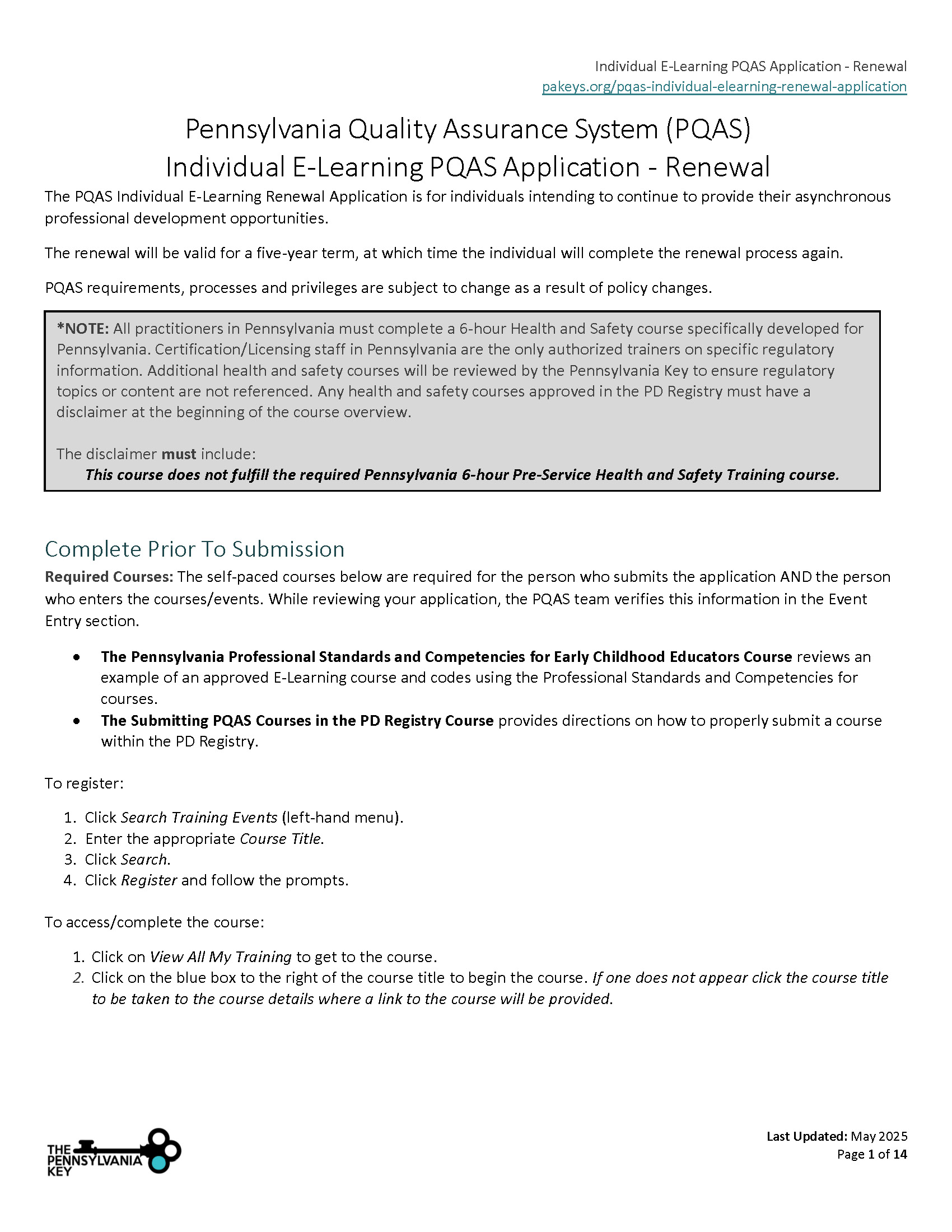 *NOTE: All practitioners in Pennsylvania must complete a 6-hour Health and Safety course specifically developed for Pennsylvania. Certification/Licensing staff in Pennsylvania are the only authorized trainers on specific regulatory information. Additional health and safety courses will be reviewed by the Pennsylvania Key to ensure regulatory topics or content are not referenced. Any health and safety courses approved in the PD Registry must have a disclaimer at the beginning of the course overview.