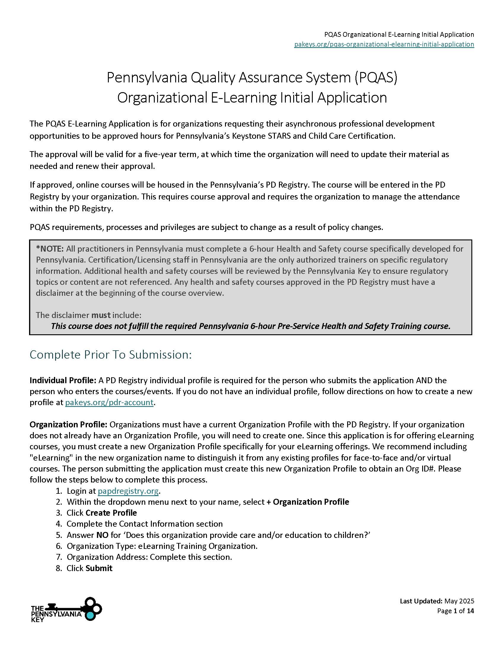 Application Fee: Along with the application and required documents, a fee of $750 is required. This fee is for the review and processing of the application, including the submitted course, and use of the PD Registry for a five-year time period. A $500 fee will be required at the time of renewal. Once approved, you can enter unlimited courses/events within the PD Registry. Please search the course title PQAS Initial Application Fee for Organizational E-Learning Review to submit payment via event registration and submit the emailed receipt with the application.