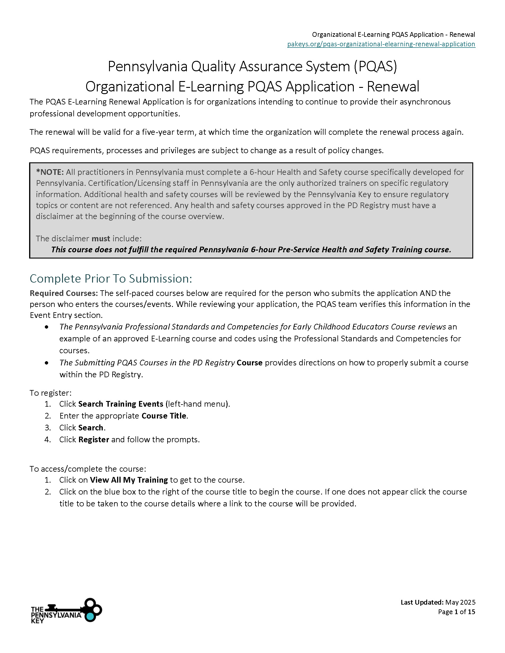 Application Fee: Along with the application and required documents, a fee of $500 is required. This fee is for the review and processing of the application, including the submitted course, and use of the PD Registry for a five-year time period. Once renewed, you can enter unlimited courses/events within the PD Registry. Please search the course title PQAS Renewal Application Fee for Organizational E-Learning Review to submit payment via event registration and submit the emailed receipt with the application.